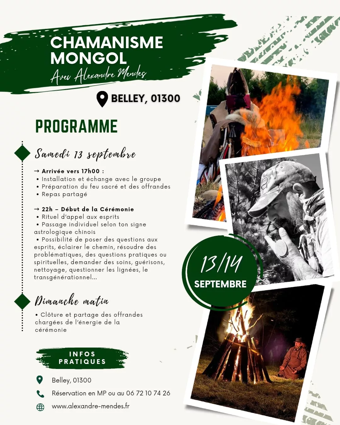 L’appel aux esprits sera mené selon la tradition ancestrale mongole – un feu rituel pour un groupe réuni autour de questionnements et de recherches personnelles ou une quête d’ordre plus général.